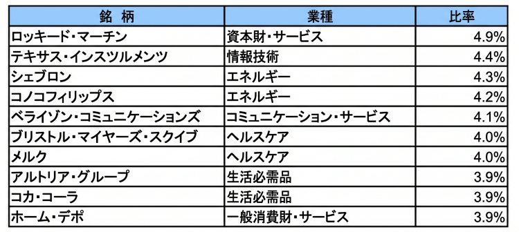 楽天SCHDの“元”となっている米国ETF「SCHD」は、10年以上連続増配企業を中心とした組み入れが行われており、強い財務基盤を持つ銘柄が厳選されています。