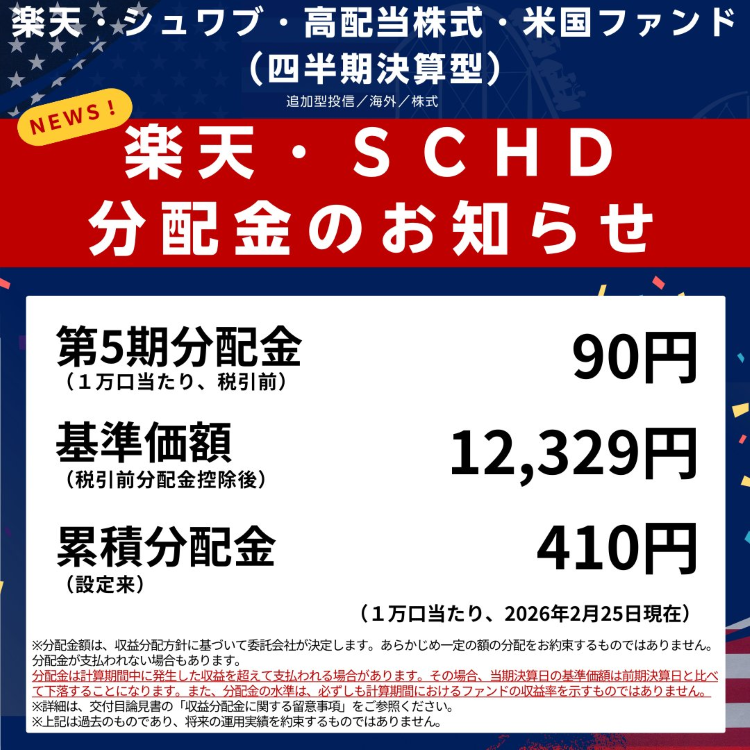 今回は、先日発表された「楽天・シュワブ・高配当株式・米国ファンド(通称:楽天SCHD)」の、2026年2月の最新・分配金情報をお伝えします。